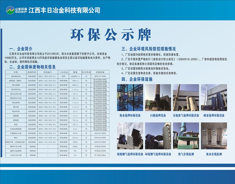 江西豐日冶金科技有限公司成立于2012年3月,注冊(cè)資金15000萬(wàn)元,現(xiàn)為山東環(huán)保集團(tuán)旗下控股子公司,落戶于江西省宜春市袁州醫(yī)藥工業(yè)園。公司年回收再生十萬(wàn)噸廢舊鉛酸蓄電池項(xiàng)目占地62.41畝,總建筑面積42180㎡,總投資3.5億元,于2020年5月份投入生產(chǎn),自生產(chǎn)以來(lái)運(yùn)行穩(wěn)定,年產(chǎn)值達(dá)10億元以上,年納稅1億元以上。